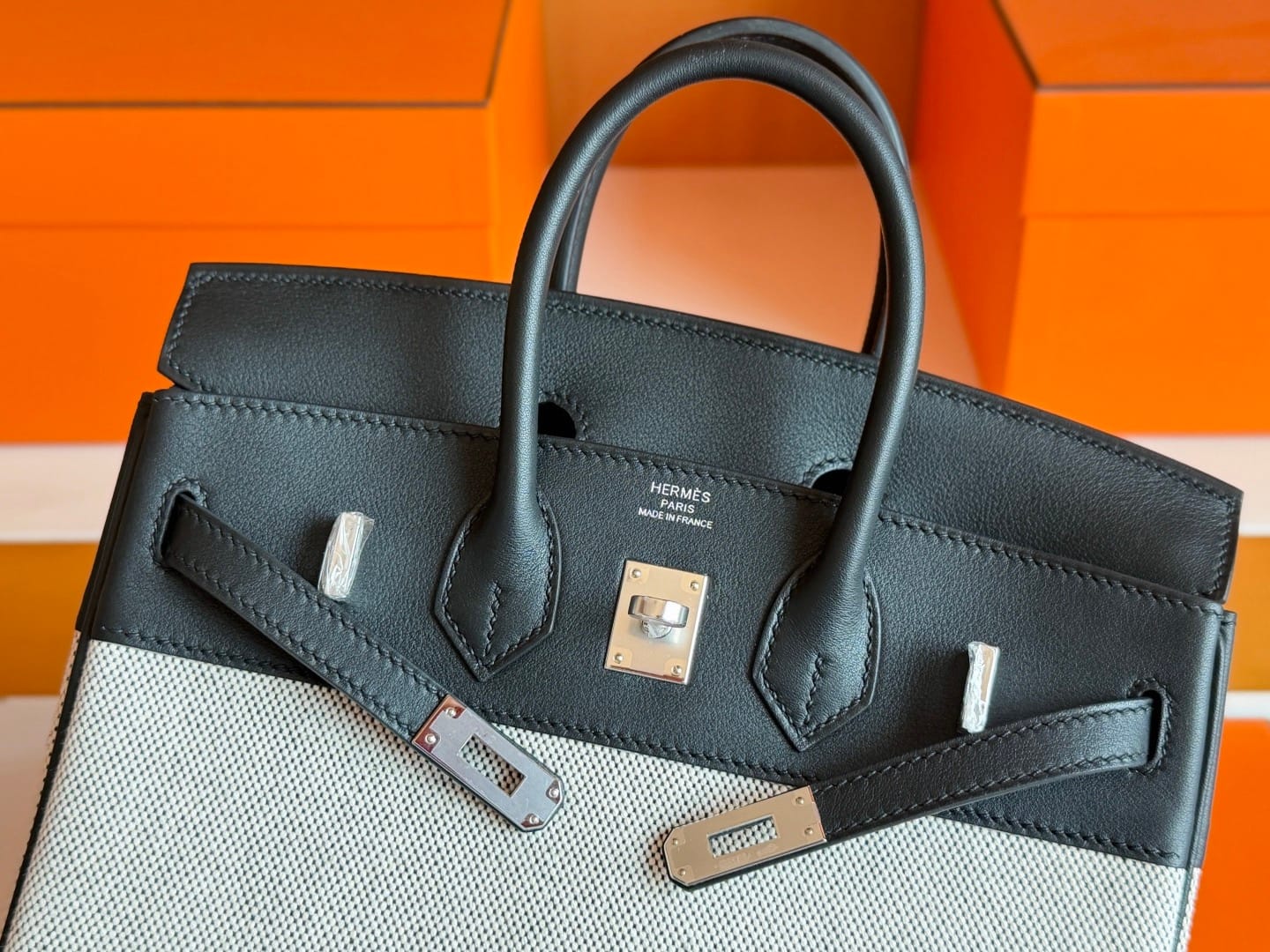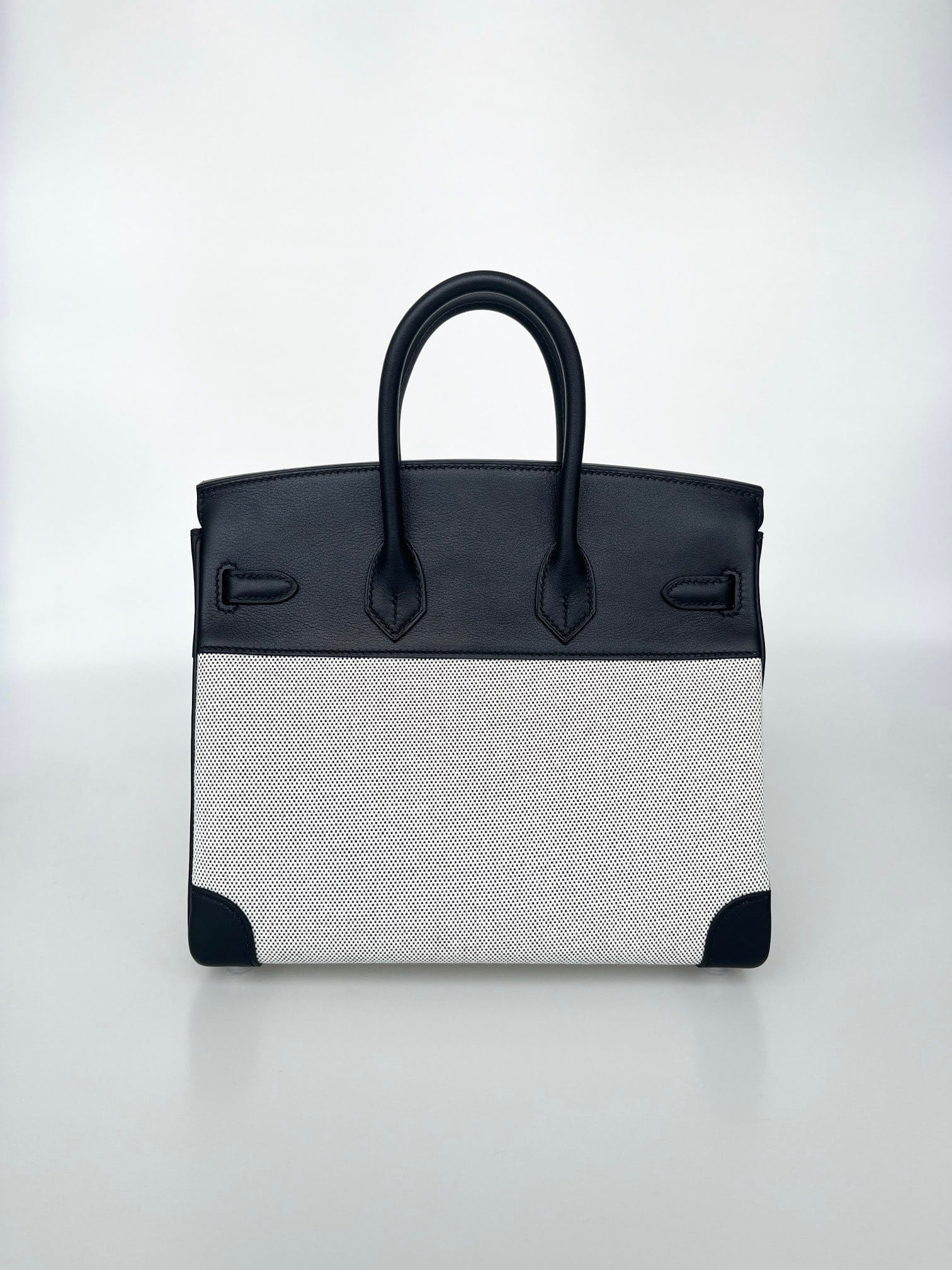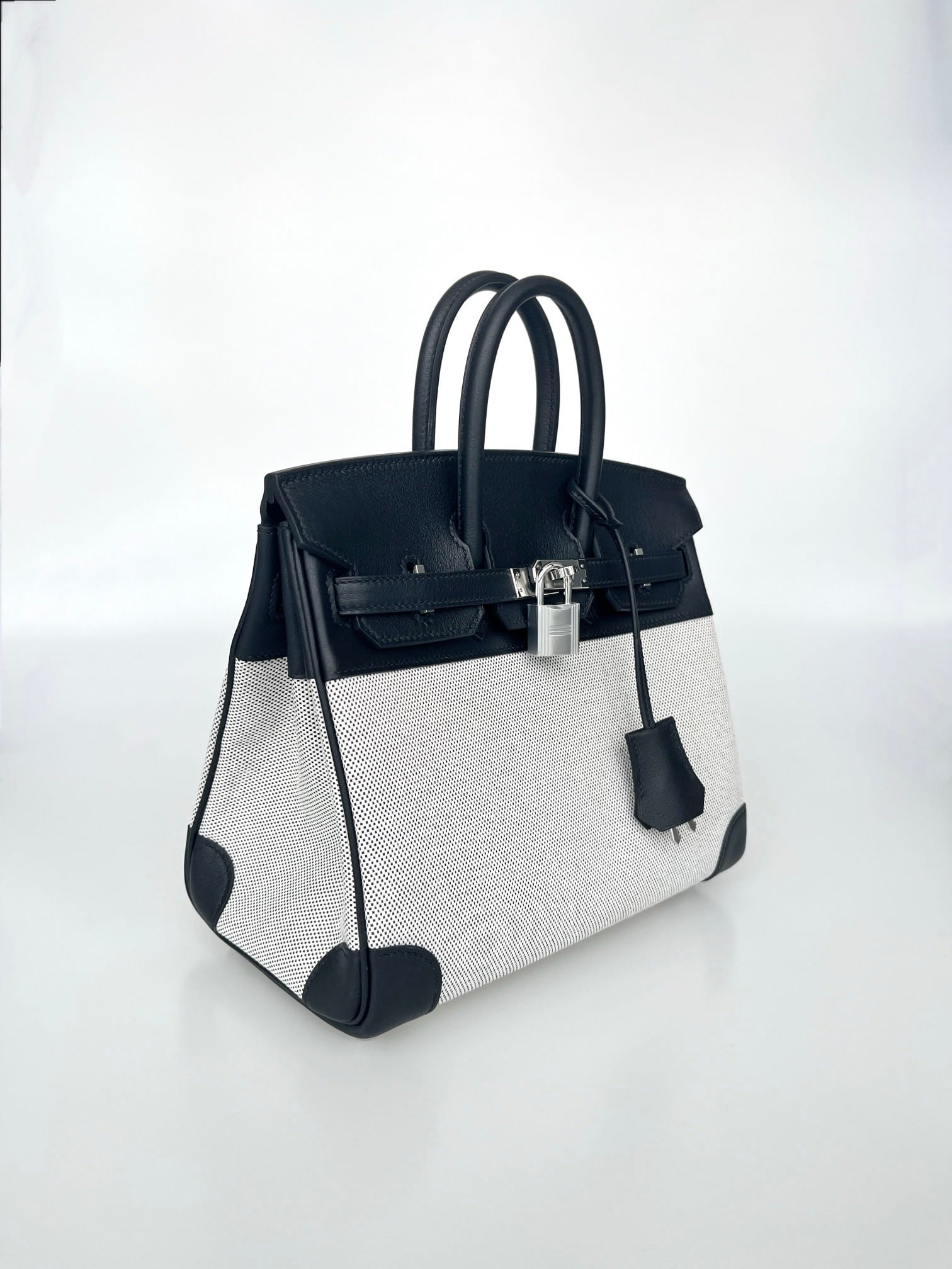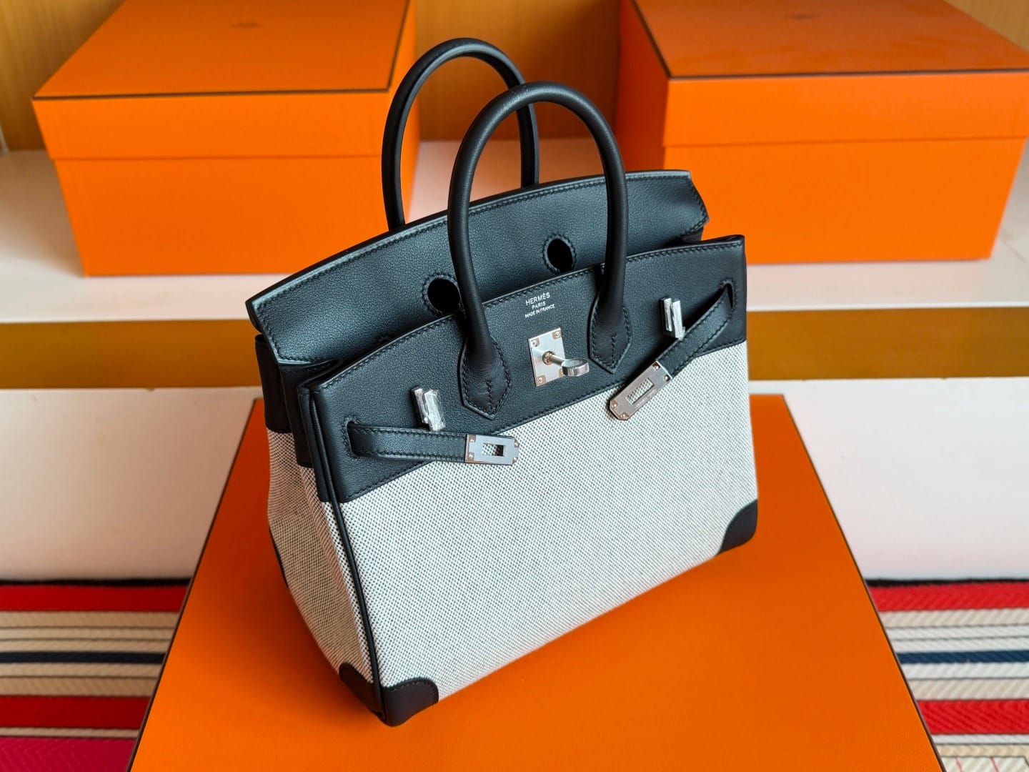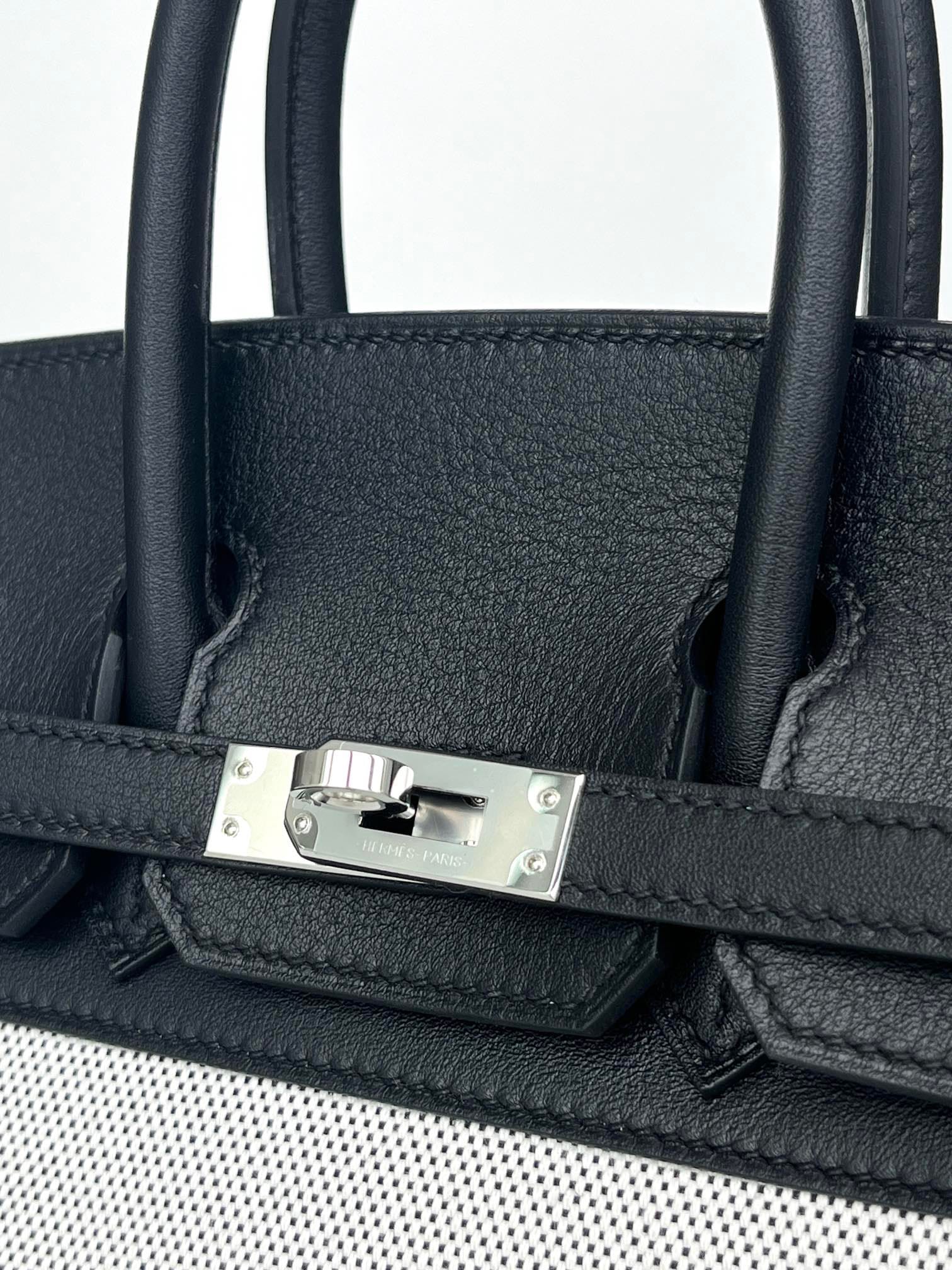 Hermes Birkin 25 Black Swift Leather & Toile Retourne Handbag Palladium Hardware