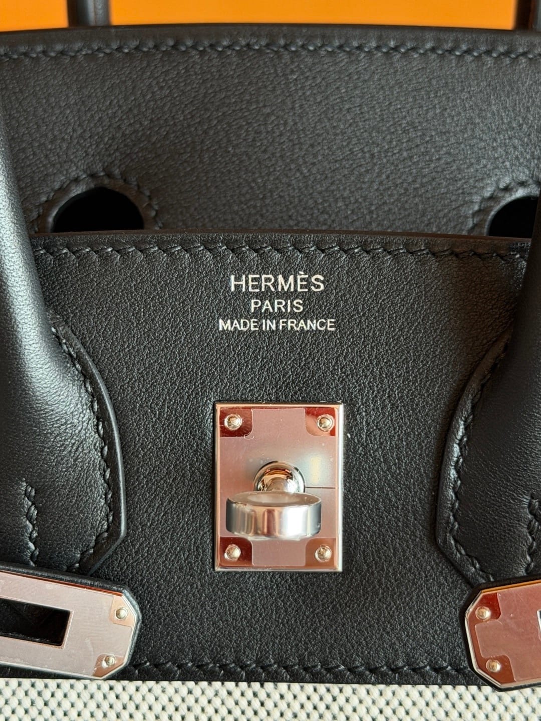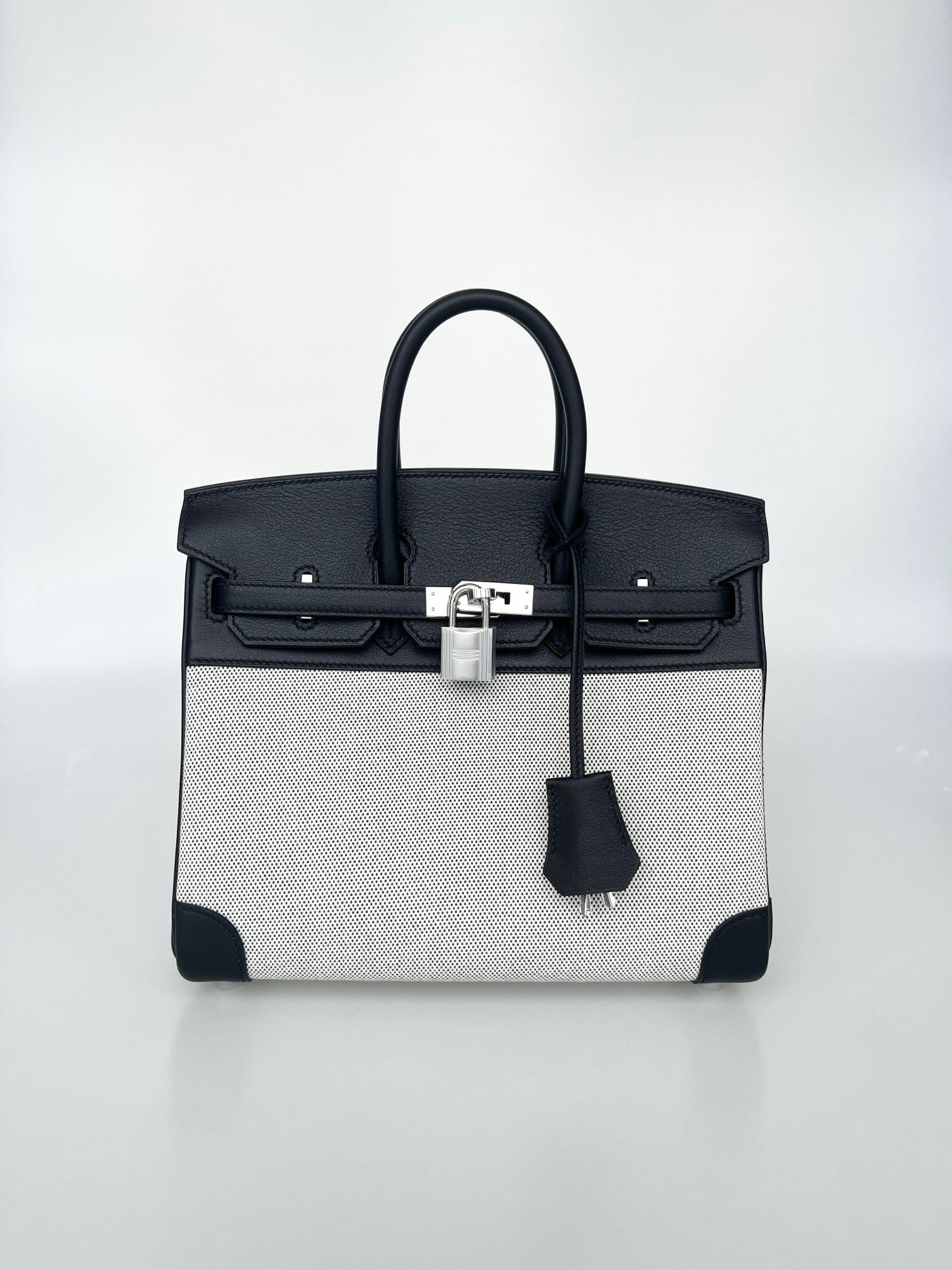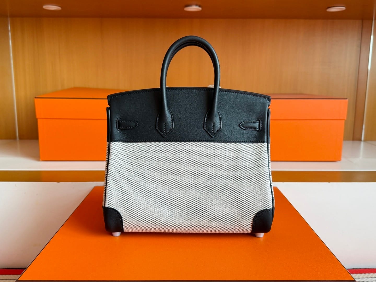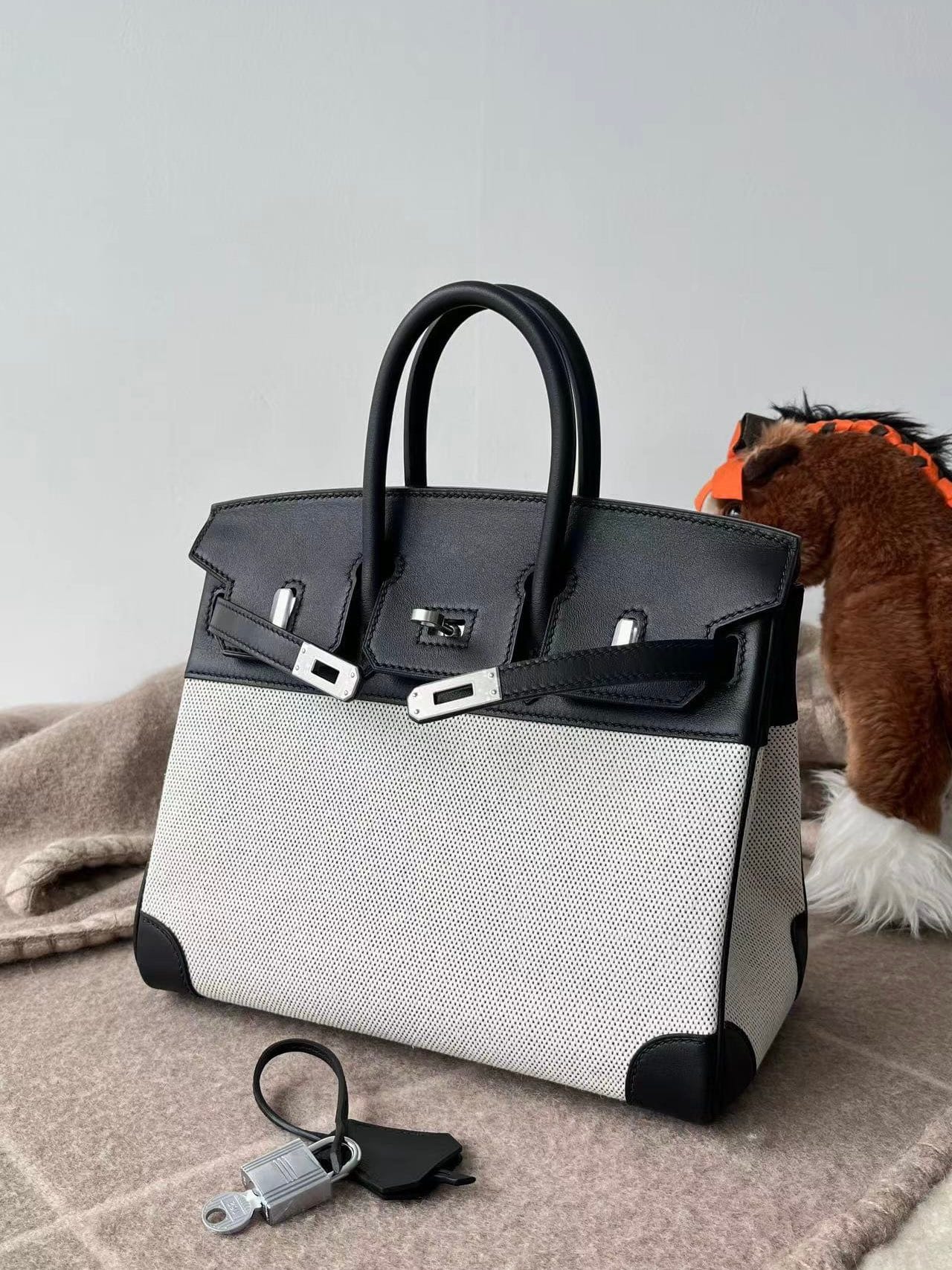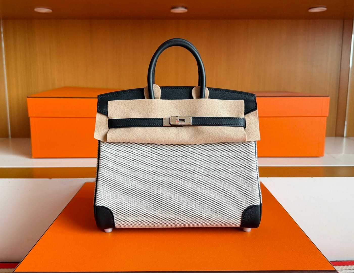 Hermes Birkin 25 Black Swift Leather & Toile Retourne Handbag Palladium Hardware