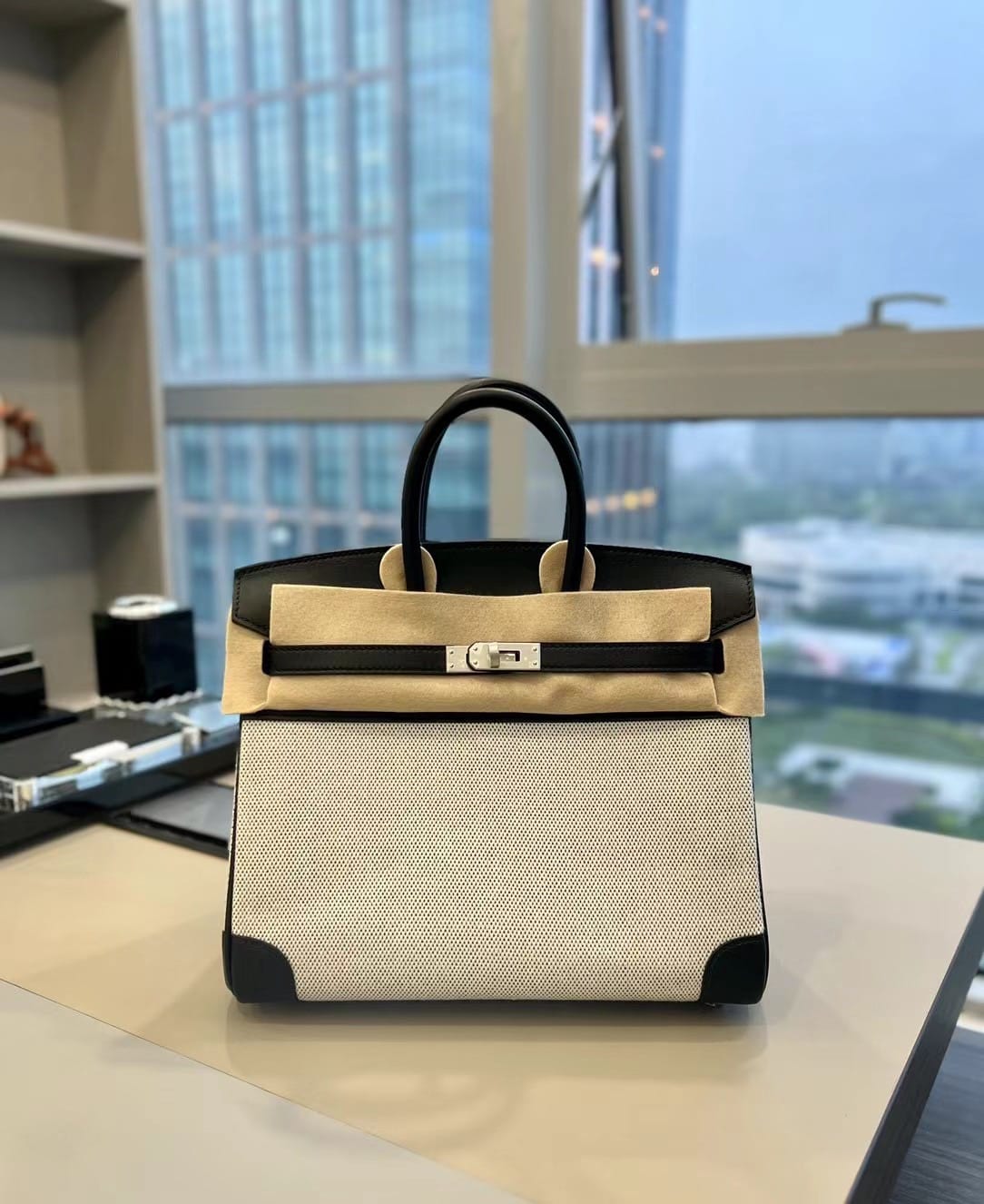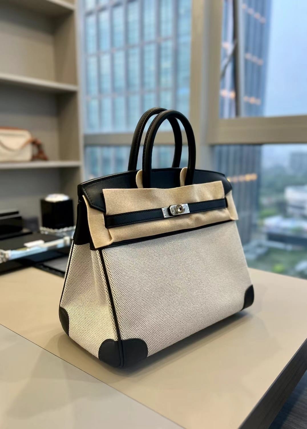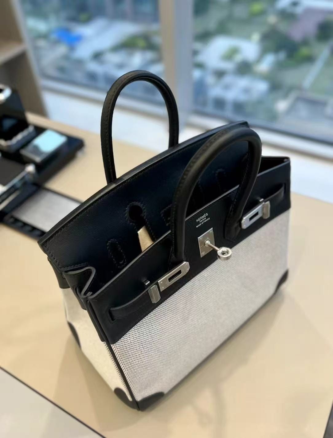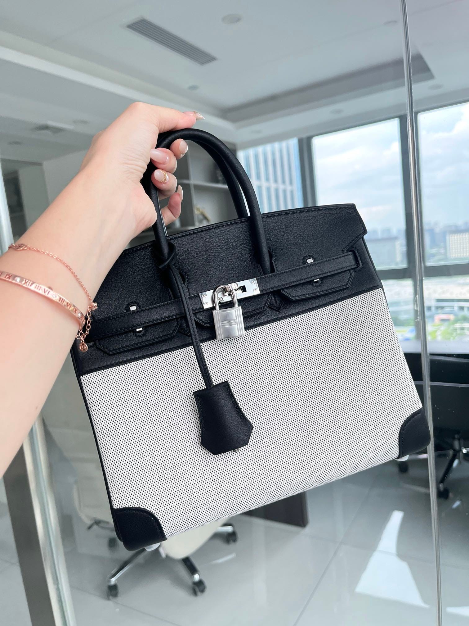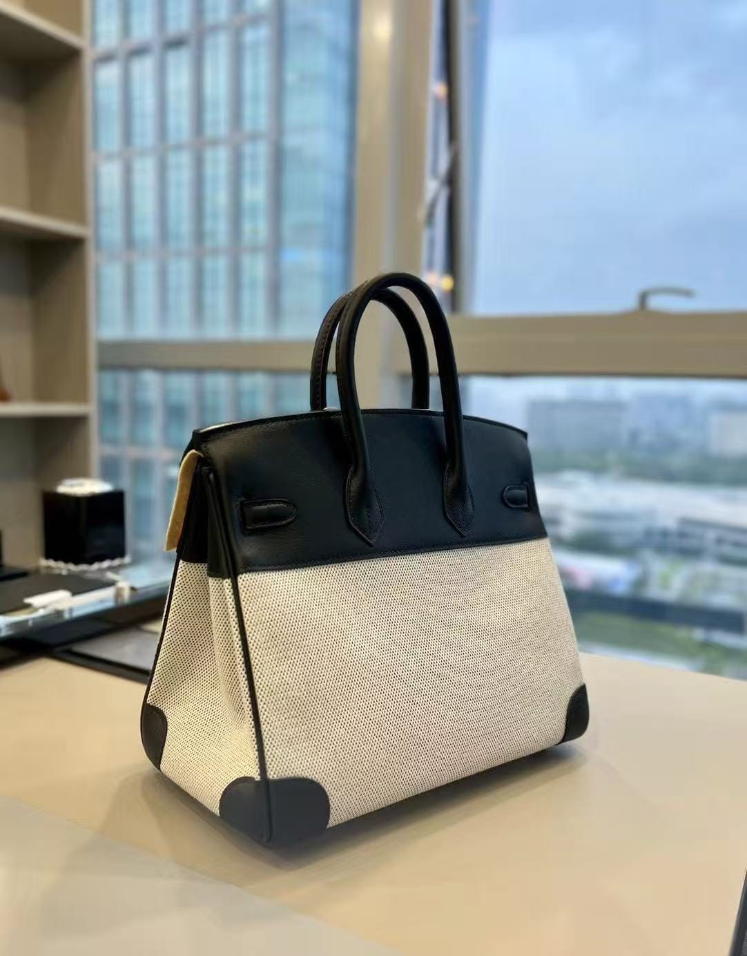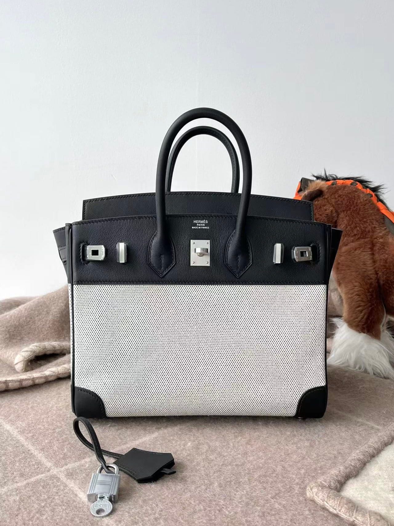Hermes Birkin 25 Black Swift Leather & Toile Retourne Handbag Palladium Hardware