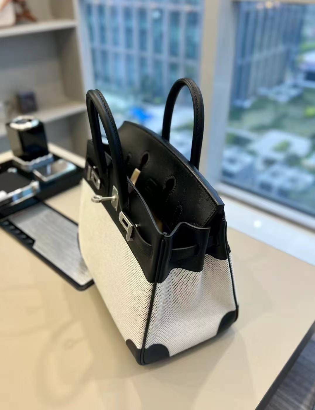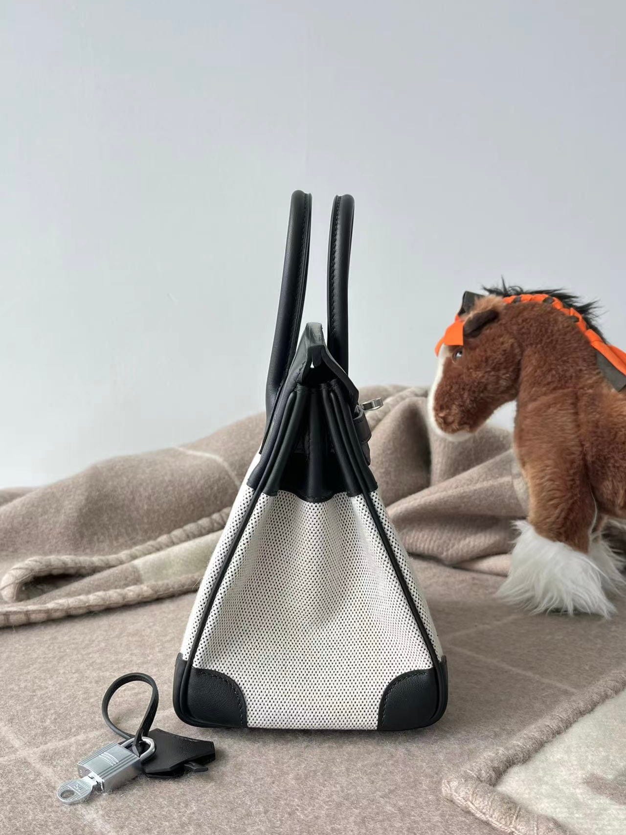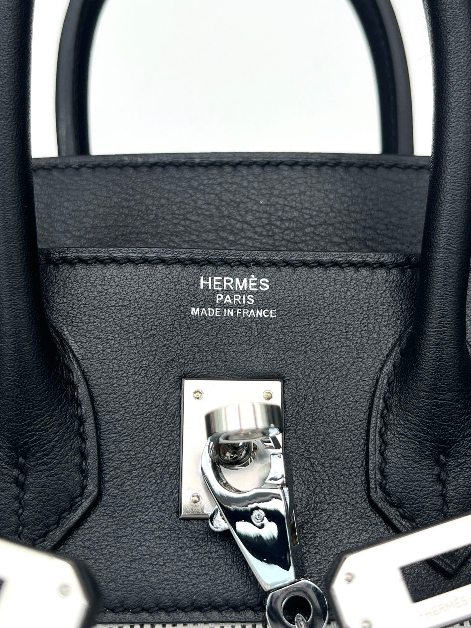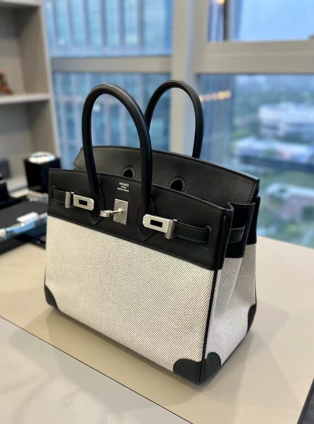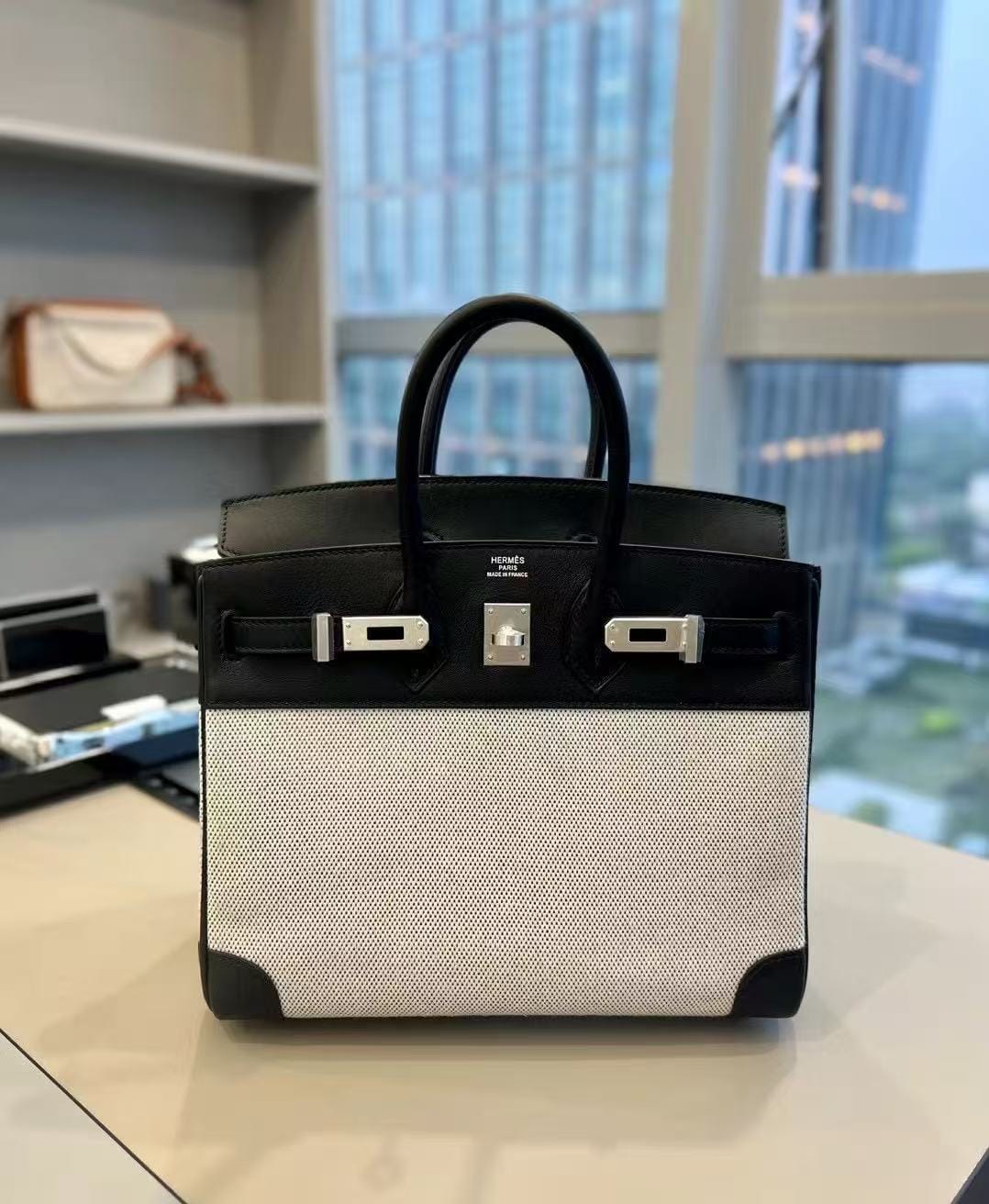 Hermes Birkin 25 Black Swift Leather & Toile Retourne Handbag Palladium Hardware