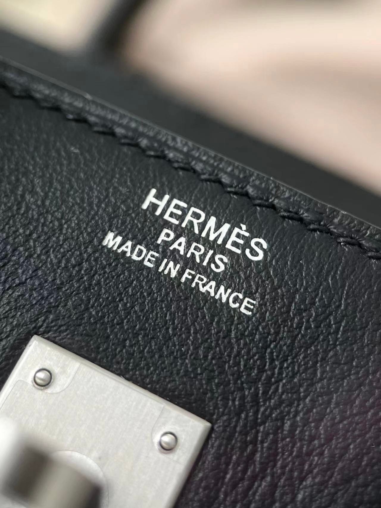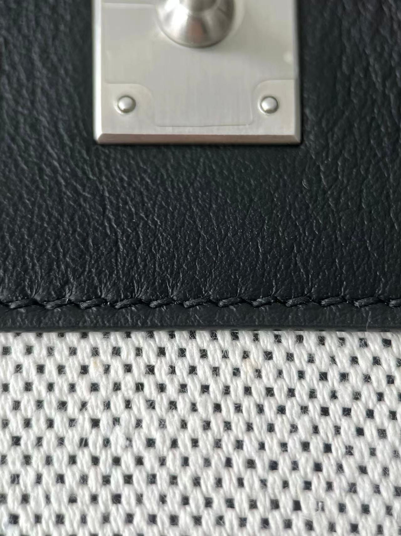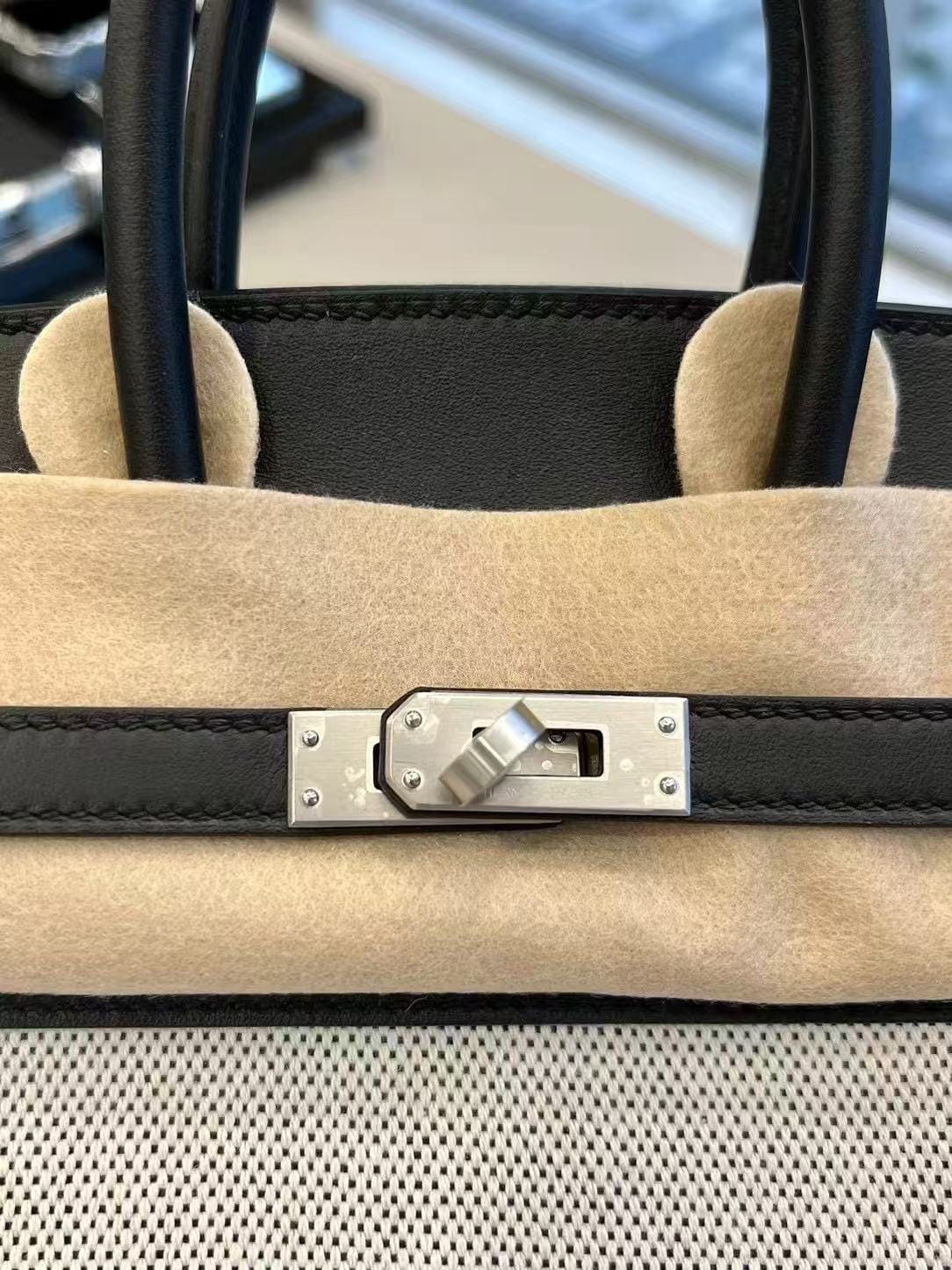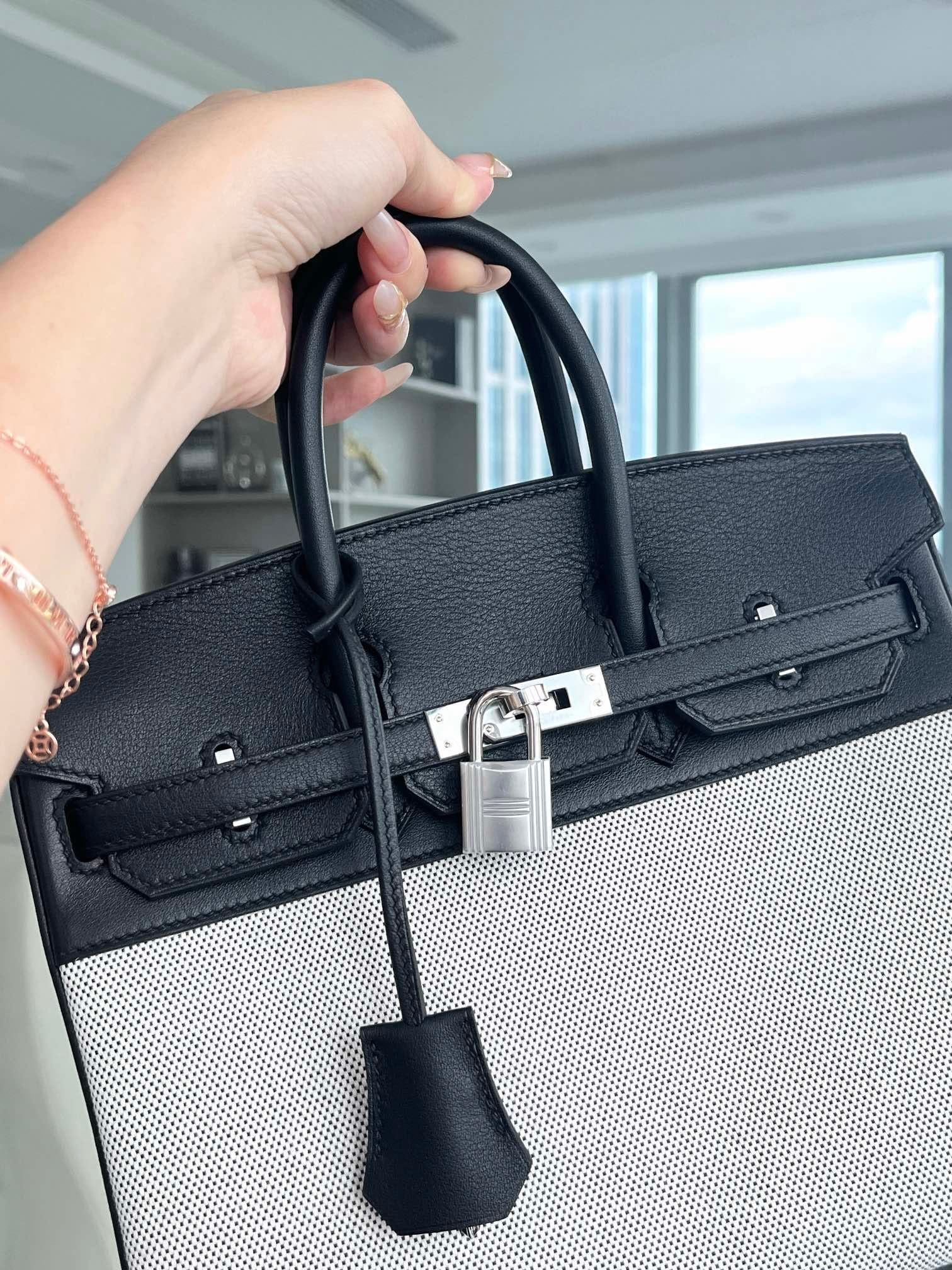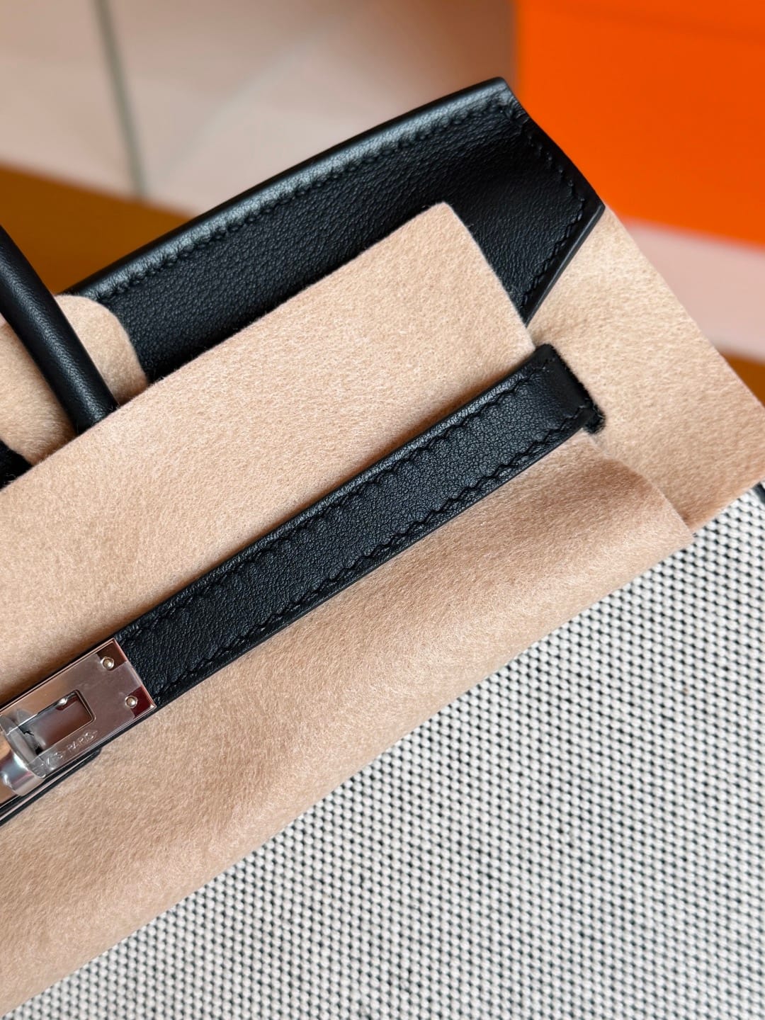 Hermes Birkin 25 Black Swift Leather & Toile Retourne Handbag Palladium Hardware